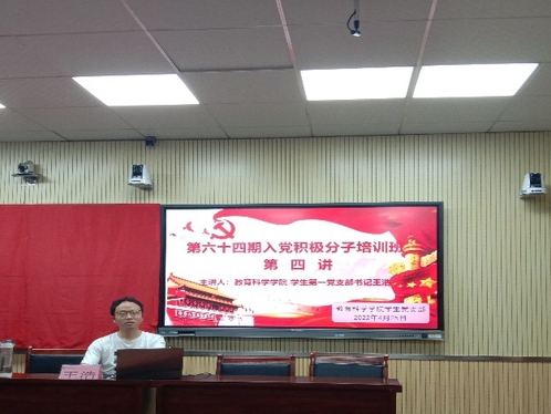 2022年4月25日晚,教育科学学院第六十四期入党积极分子培训班第四讲于教育大楼1316A会议室顺利举行,教育科学学院学生第一党支部书记王浩老师主讲本期课程。