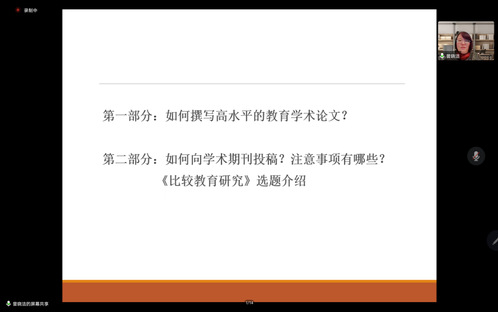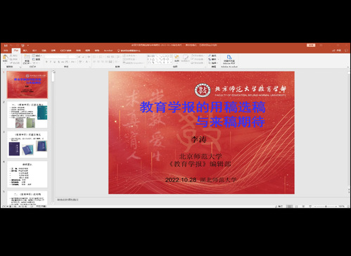本次系列活动邀请了《教育发展研究》的编辑部主任林岚老师在线开展了以“什么是好的学术表达:编辑的视角”为主题的讲座,从编辑的视角出发,向大家阐述了如何写作与表达;北京师范大学《教育学报》编辑部主任、教育学博士李涛以“《教育学报》的用稿选稿与来稿期待”为主题开展线上讲座,强调论文选题与题目的重要性与注重在撰写论文时的问题意识;北京开放大学李本友教授在线开展了《课题申报与申报书规范撰写》为主题的讲座,主要从如何选题、课题申报的准备、课题申报的基本程序、课题申报书的规范撰写和评审课题的“九看”五个方面展开讲解;北京师范大学副编审、《比较教育研究》期刊社编辑曾晓洁主任开展了主题为“教育学术论文的写作与发表”的线上学术讲座,详细介绍了一篇高水平的教育学术论文的写作规范、发表条件、注意事项等。