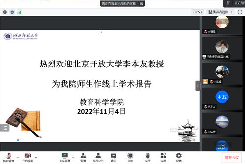 为进一步加强教师队伍建设,为广大教师搭建更广阔的学术交流平台,营造宽松活跃的学术交流氛围,了解学术动态,加强学界交流。同时,以促进高层次科研项目的申报和高水平学术论文的发表为目标,培育标志性学术成果,在高层次项目申报和高水平论文发表方面取得新的突破。教育科学学院于202210月至11月开展“磁湖学术活动日· 教育科学学院科研能力提升系列活动”。我院教师及全体研究生参加了此次活动,活动由副院长付光槐主持。