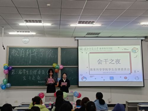 为加强学生干部之间的沟通交流,拉近成员之间的距离,教育科学学院学生自律委员会秘书部于11月25日晚在科技大楼9208举办了会干之夜。参加本次活动嘉宾有党总支副书记刘刚、辅导员秦姗姗、校学生自律委员会副主席党琪、院学生自律委员会主席刘红、罗玙萋。教育科学学院第二届学生自律委员会全体成员也参加了此次活动。