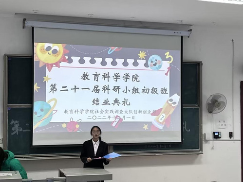 为了激励科研小组学员们继续保持热情,努力奋斗,教育科学学院社会实践调查大队创新创业部于12月1日下午在教育大楼1J23开展了第二十一届科研小组初级班理论培训第四讲暨结业典礼。参加本次活动的嘉宾有学生团总支副书记吴嘉欣、王奡骏,学生会副主席谭威,学生自律委员会主席刘红。科研小组全体成员参与了本次活动,社调干事刘诗雅主持本次活动。