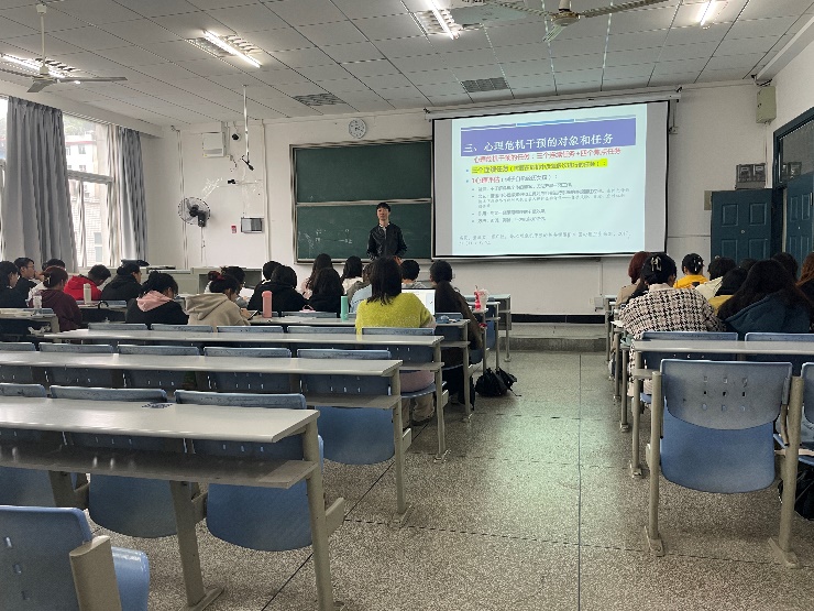 为了进一步提高课堂教学质量、提升专任教师的教学技能,4月4日下午,心理学系在科技大楼9401开展了示范课听评课活动,活动由岳鹏飞博士主讲《心理危机干预》的相关内容。