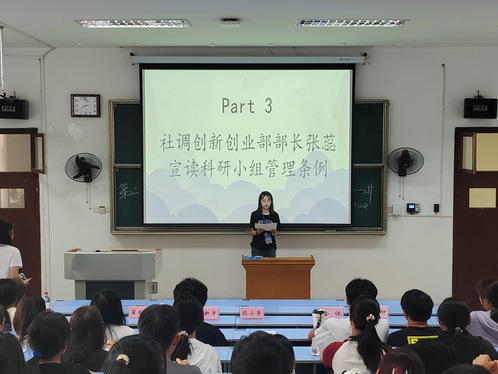 活动伊始,教科院团委副书记段小芳表达了对新学员的期望,她提出全体成员要充分认识大学生创新的重大意义,并强调学员们要以科研小组为平台,向优秀榜样看齐。接着,刘朵为同学们带来了精彩纷呈的第一讲——报告心得培训,她从报告的含义、结构、撰写、格式等方面一一进行讲解,同学们认真学习相关知识,表达自己的见解。最后,社会实践调查大队创新创业部部长张蕊与刘诗雅上台详细介绍了科研小组管理条例和作业格式,并宣布本次会议圆满结束。