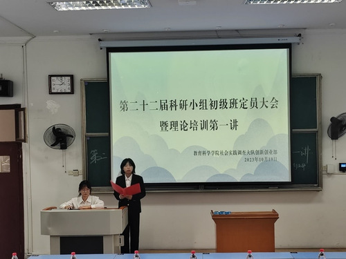 为进一步提升同学们的科研素养,教育科学学院于10月19号下午两点二十在教育大楼1j23举办第二十二届科研小组初级班定员大会暨理论培训第一讲。参加本次活动的有教育科学学院团学主席、团副,校社调中心调研组副组长刘朵及全体学员、导生。
