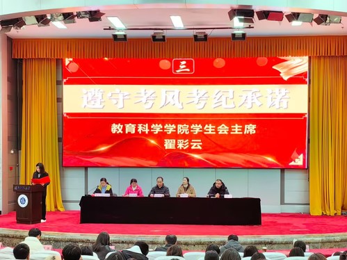 会议伊始,教育科学学院副院长张小菊教授作诚信考试报告,向大家详细讲解了考试纪律与相关违纪行为处理规则,明确考试作弊的弊端,引导学生诚信应考。接着由23D04班班主任陈云、第二十四届学生会主席翟彩云分别代表学院全体教师与学生作出考试承诺,号召大家共同营造“诚信考试光荣、违纪作弊可耻”的考试氛围。