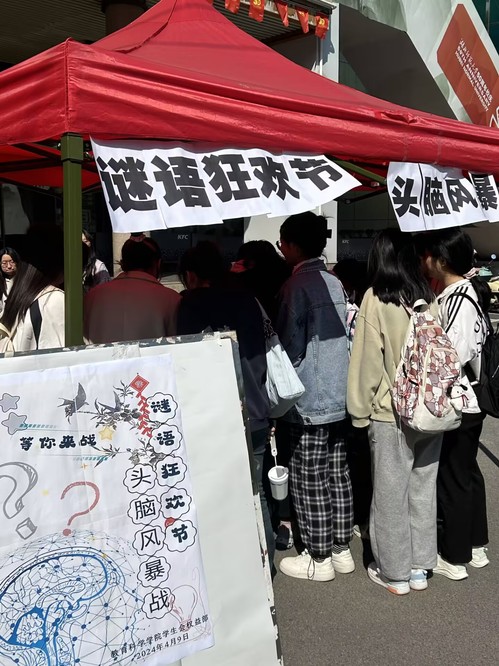 在大学的校园里,学生们充满了好奇心和求知欲。为了丰富校园文化生活,提高同学们的思维能力和逻辑推理能力,激发同学们的思考热情,让大家可以在轻松愉快的氛围中共同探索谜底,感受头脑风暴的乐趣。教育科学学院学生会权益部于4月9号在琼林苑门口开展此次“谜语狂欢:头脑风暴来袭”摆点活动。