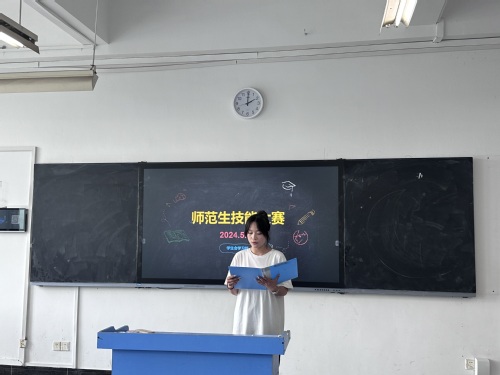 活动伊始,各位选手井然有序地到达比赛场地,评委们也到场落座,比赛顺利地进行着。随后,比赛按时开始,由主持人宣读比赛规则和流程。比赛分为即席演讲、模拟授课·板书、说课以及评委提问四个环节。赛前,选手们认真准备演讲内容,并为授课主题制作了精美的课件;授课时,选手们用生动形象的语言和通俗易懂的方式呈现了教学内容;评委提问时,各位老师见解独到,针对每位选手的表现提出了相应的建议。最后由各位评委对选手的表现进行公正的评分,最后抉择出优秀的选手代表我院参加校级师范生教学技能竞赛。