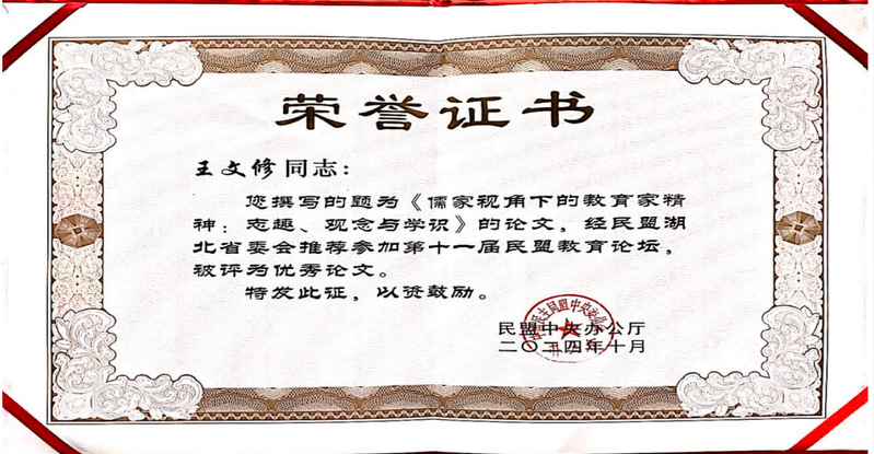本次论坛由民盟中央教育委员会、民盟山东省委员会主办,共收到民盟中央教育委员会、启真智库、以及30个省级民盟组织提交的论文。经专家严格评审,最终评选出71篇优秀论文。湖北民盟共有3篇论文获评优秀论文奖,我校民盟盟员、教育科学学院王文修博士撰写的论文《儒家视角下的教育家精神:志趣、观念与学识》为其中一篇获奖论文。
