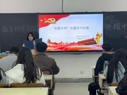 为贯彻落实《国家语委关于深入实施“典耀中华”主题读书行动的指导意见》精神,加快建设教育强国,引导我院学生加强经典书籍阅读,教育科学学院学习部于11月7日下午在教育大楼1201开展了“典耀中华”主题读书比赛活动。教育科学学院教学秘书谭燕军,辅导员伊力扎提、夏青腾作为本次比赛的评委莅临比赛现场。