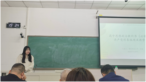 研究生耿雨欣、赵蕾、刘洁如参加教科书研究生学术沙龙,分别以《初中〈道德与法治〉教科书人物插图的编排特点与教学建议》《高中思想政治教科书(必修)中的共产党形象梳理及教学策略》《〈道德与法治〉教材与新课程标准一致性研究——以法治专册为例》为题进行了发言汇报。