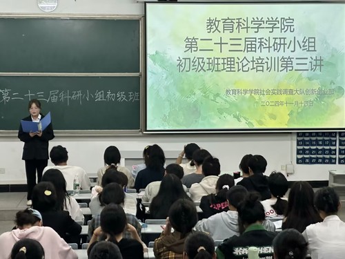 为促进科研小组学员对师范技能类和创新创业类赛事的了解,提高学员参赛积极性,教育科学学院社会实践调查大队于11月14日在科技大楼9605教室开展第二十三届科研小组理论培训第三讲。教育科学学院2202班陈冠佑,2202班李响与全体科研小组学员共同参与此次培训。