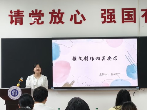 接着,青年传媒中心前任部长耿安逸及袁可欣分别就通讯稿及推文相关工作展开详细讲解,强调各部分的写作要点,指出要注重事实的准确性和语言的简洁,要求部长们注意投稿时间,按时完成投稿。