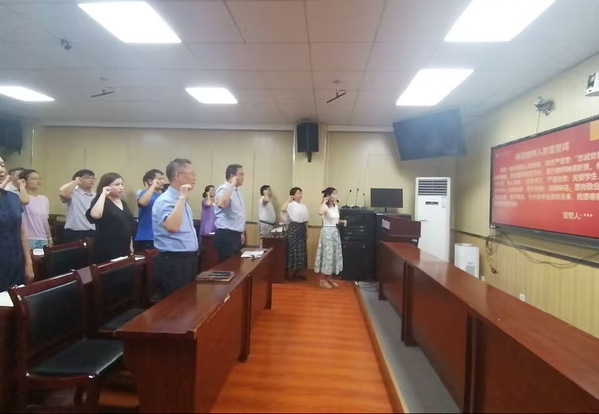 首先,教师代表何灿分享了自己的教学科研工作经验。鼓励新教师尽快适应新环境,热爱教学,潜心科研,融入学校大家庭。随后,新进教师代表杨钰倩、梁鹏先后发言。他们表示非常荣幸加入教科院这一富有活力和凝聚力的集体,并对学院提供的平台和支持表示感谢,同时结合个人学术背景与教育理想,会向优秀同事学习、积极投入教学科研工作。然后老师们进行庄严宣誓,表达致力于教育事业的决心,进一步坚定了教师的责任和使命,以饱满的热情和坚定的信念投入到教育工作中。同时,院领导为新入职教师颁发了入职纪念品。